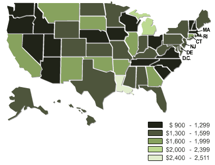Here is a chart of average auto insurance rates by state, via AARP.com, shaded by overage ranges. Click for an interactive map with more details and a ranking.