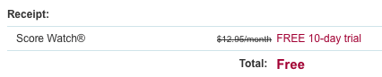 IMPORTANT INFORMATION: When you order your free FICO Score here, you will begin your 10-day trial membership in Score Watch®. If you don’t cancel your membership within the 10-day trial period, you will be billed $12.95 for each month that you continue your membership. You may cancel your trial membership anytime within the trial period without charge.