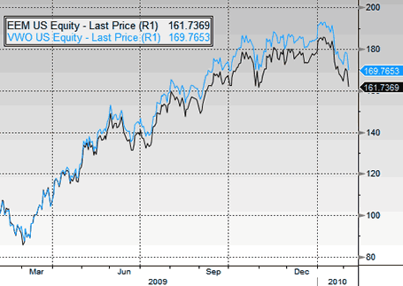 Performance-wise, iShares’ EEM has recently been lagging behind Vanguard, as was pointed out in this IndexUniverse post. In 2009, EEM rose 68.8% but VWO gained 76.3%, nearly 8 percentage points more.
