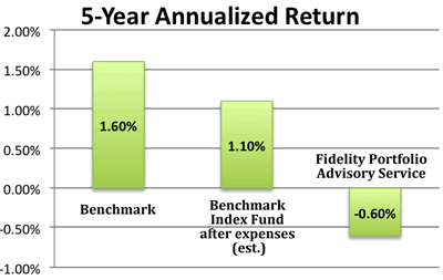 Over the past 5 years, the Fidelity Portfolio Advisory Service managed to construct a portfolio that lagged a simple index fund portfolio by 1.70% annually. That’s a huge difference over time. Use any compound interest calculator and stick in two numbers that differ by 1.7%, and you’ll see the effect of compound interest working against you for a few decades. Why did this account perform so poorly relative to its benchmark? Isn’t it supposed to beat the benchmark?