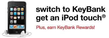 You must have or request a KeyBank Rewards debit card (Key Privilege Select clients must have or request a KeyBank Rewards World debit card) and enroll in the KeyBank Rewards program. There is a $20 annual fee for the KeyBank Rewards Program that will be waived for the first year. Qualifying debit card transactions include signature, PayPass®, and PIN-based purchases only. Direct deposit transactions are limited to: payroll, Social Security, pension, and government benefits. Automated payments exclude Key Bill Pay, debit card automated payments, PayPal® transactions, and account-to-account balance transfers. Limit one iPod touch® per qualifying account. Limit one iPod touch® per individual. The value of the iPod touch® and, if applicable, the $25 iTunes® card will be reported on Form 1099-INT. You will receive your iPod touch® within 90 days of meeting requirements. Offer available to individuals without an existing checking account at KeyBank as of 4/30/10. Employees of KeyBank, its affiliates, and subsidiaries are not eligible for this offer. If you close your account within 180 days of account opening, you will be charged a $25 account early closure fee. Accounts overdrawn or closed as of 10/1/10 are not eligible for this offer.