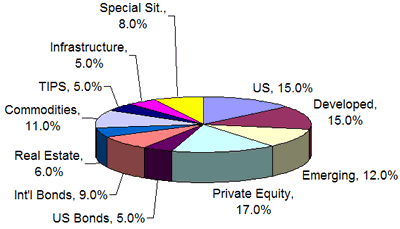 Inflation is another big concern due to huge global growth, and thus there is a sizable allocation to real assets – commodities, real estate, inflation-protected bonds, and infrastructure (publicly traded equity and debt securities of utilities, airports, ports, roads, hospitals, etc.). Special Opportunities could mean speculative plays such as distressed debt or long-term environmental gambles like carbon credits.