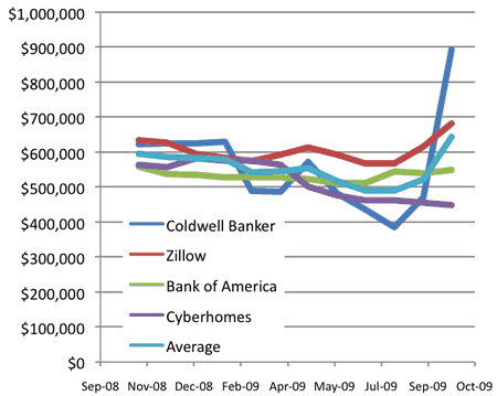 Volatility. Bank of America appears to have had the least volatility over the last year, while Coldwell Banker has the wildest swings. I believe the recent upswings are due to some more houses being sold in my area at the higher range recently, while for a time very few houses were being sold and those were at the low end. If so, it would follow that Coldwell Banker weighs recent sales more heavily.