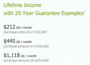 Since my wife and I don’t have any pensions to look forward to, one way to create our own pension is to buy a fixed immediate annuity. I used their quote calculator to see what I could get right now if I was 50 years old and with the 20-year minimum payout.