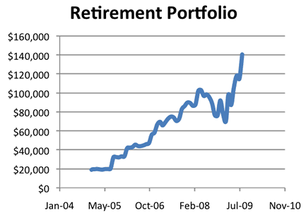 Not much stock market movement this past month. Wife’s 401k was already maxed out at $16,500 for 2009. I made another $5,000 contribution to my Solo 401k, for a total of $10,000 contributed in 2009. This makes us about 80% done with our goal of maxing out both our 401k salary contributions for 2009.