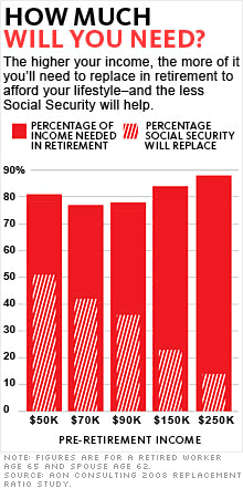 4. One thing however is that your income from Social Security is not based upon a flat, $20-25 thousand per year. If you calculate out the percentages the income levels vary based upon how much you earned pre-retirment. See here “Under current law, if you have average earnings, your Social Security retirement benefits will replace about 40 percent of your pre-retirement earnings. The percentage is lower for people in the upper income brackets and higher for people with low incomes.”, from: http://www.socialsecurity.gov/planners/morecalculators.htm