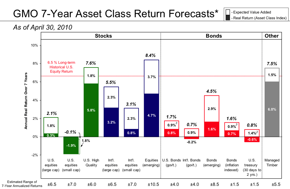 Every quarter, GMO releases a 7-Year Asset Class Forecast. You can read it and other market commentary for free by registering on their website. I wouldn’t call looking ahead 7 years a “long” time horizon, but since I’ve exploring future market returns, I figured why not throw it out there for future reference. Here’s the latest forecast as of April 30th, 2010. (Click to enlarge.)