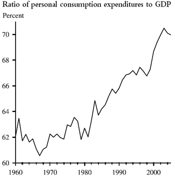 One theory is that this “wealth effect” makes us feel like we don’t have to save as much right now. Look at the graph from 1990-2001… stock market go up, savings go down. I can see this – recently both the stock market and housing prices have been flying high simultaneously. If your overall balances are skyrocketing, it’s much easier to justify buying that new car or trading up into a bigger house. Maybe people just need a good scare. Or a sudden drop in spending would lead us into a depression. Sigh.