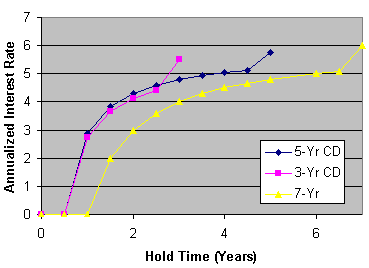 They have relatively generous early-withdrawal penalties of 180 days interest for the 3- and 5- Year CDs, and 1-Year of interest penalties for 7-Year CDs. I wouldn’t abuse this, but here is a plot of estimated interest versus hold time for the 3 CD lengths that takes into account the penalty.