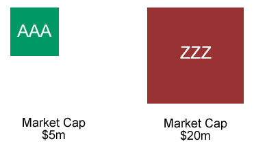 Things are going along, but then a new medical study finds that ZZZ’s widgets cause cancer, and it turns out the CEOs have been covering this up for years. ZZZ tanks, and is now trading at a penny per share, while everyone is switching to AAA’s reliable widgets. AAA goes up to a market cap of $25m ($25 per share).
