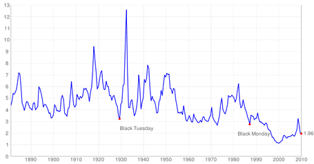 3. @DGI – Thanks for the link, here’s another chart of the S&P 500 dividend (inflation-adjusted) since 1881-2010, which includes the recent market drops: